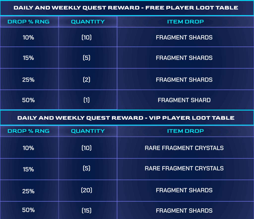 When the Season starts we will enable the quests in the game – every quest will give you a Quantum Cache, a box that will instantly open and give you a random amount of Fragments! The amount you get is random, but the range will depend if you have Pilot Badge, NFTS and other things!